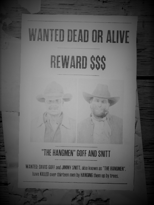 Having taken a picture of the board earlier in the day, I was able to easily identify who the targets were, but I wanted to know more. Turns out, “The Hangmen” were dangerous men known for hanging their victims. At least 13 people have died by their hands. The sheriff informed me that most of their crimes were committed in the South, though that bit is downplayed as the government continues to put a positive spin on the unity of the nation. These are the types of men the bounty hunter initiative is bringing to Justice.